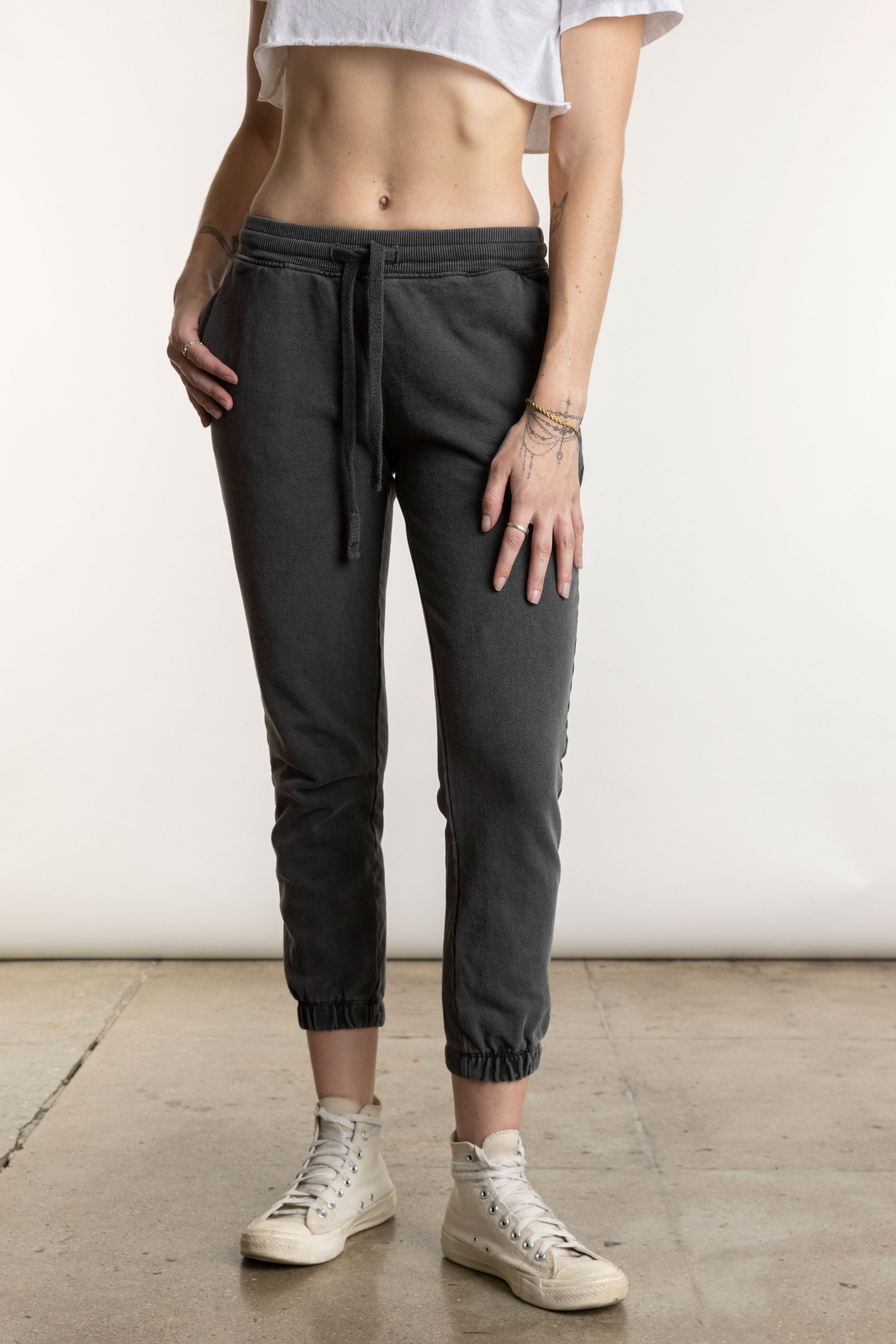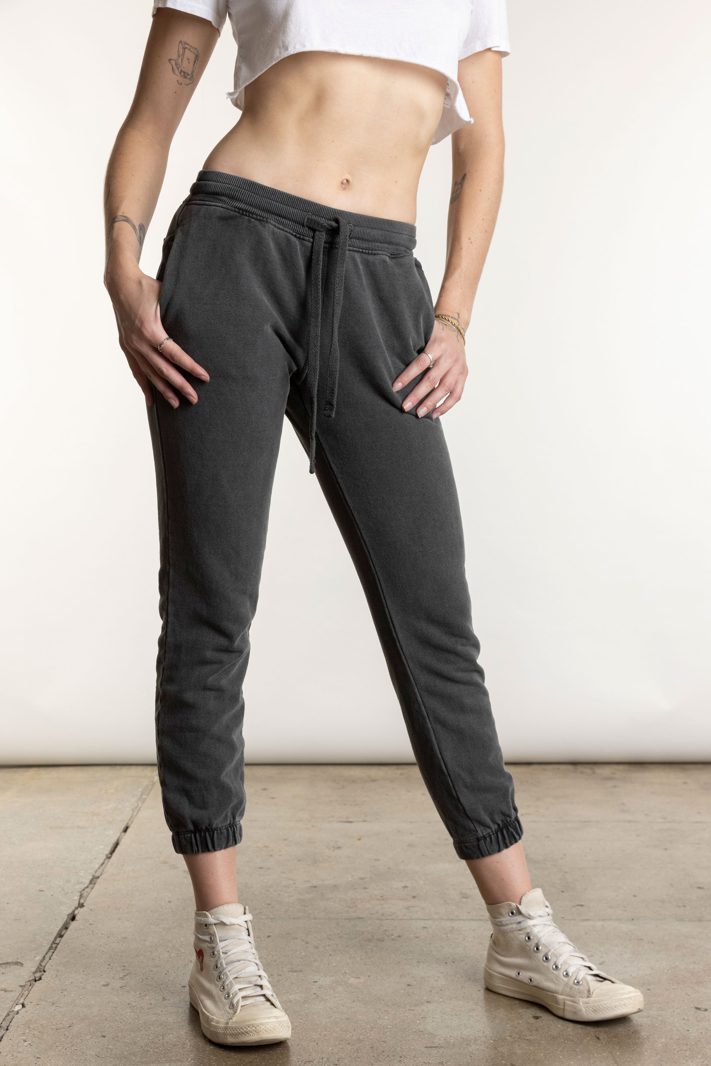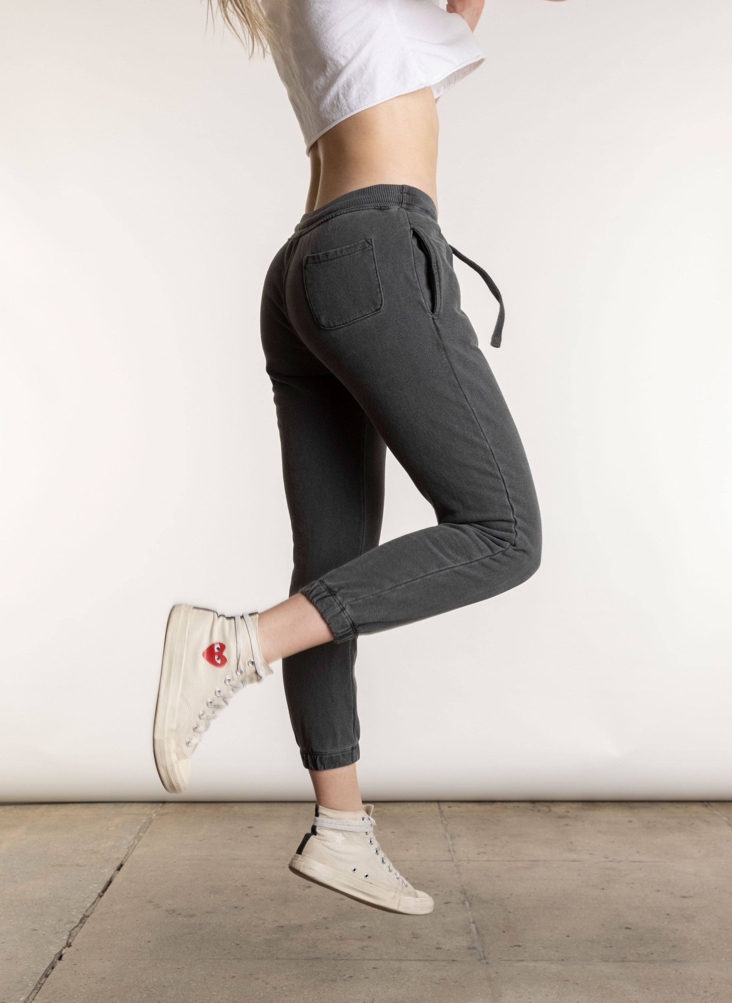 Delight in the timeless appeal of our Vintage Black Women's Sweatpants. Crafted from high-quality French Terry 100% Cotton. These Vintage Black Women's Sweatpants feature a unique pigment dyeing wash that elevates casual wear to chic attire. The garment dye process not only enhances the softness of the fabric but also ensures that each pair is slightly unique, just like you. Whether you're lounging at home or out for a casual meet-up, these pants will keep you looking fashionable and feeling cozy all day long.